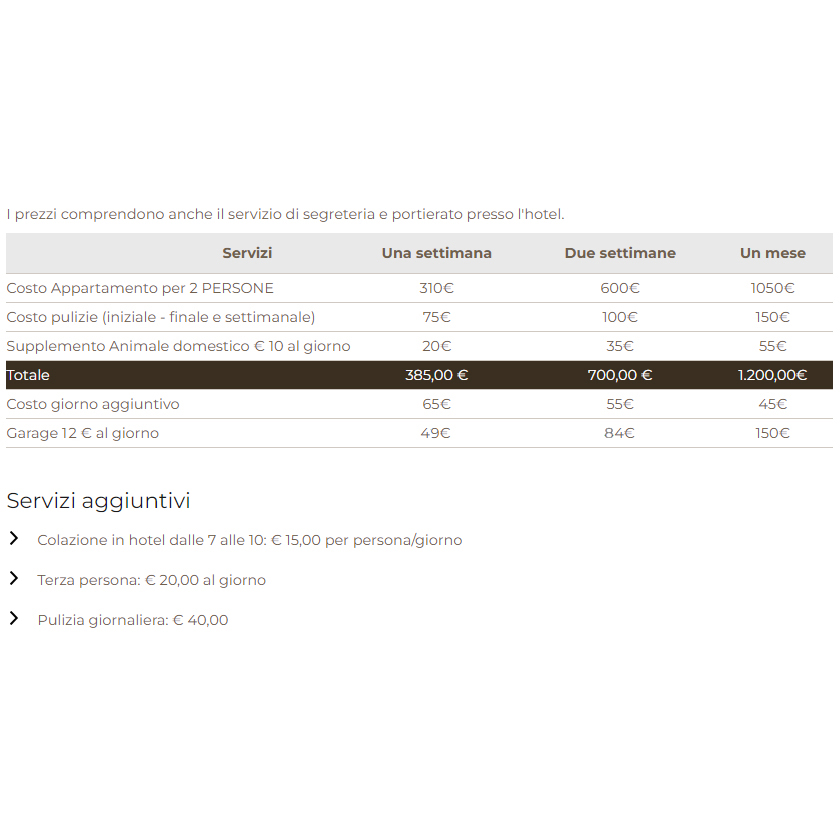 Tutti i locali sono climatizzati e dispongono della propria biancheria, TV, Internet WI-FI, telefono, asse e ferro da stiro, ascensore.